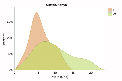 The survey involved 243 farmers in Kericho County: 147 farmers using Virtual Agronomist (VA) and 96 adjacent plots where VA was not used, taken as farmers’ normal practice (FP). Plot areas were measured by walking plot boundaries with a geopositioning system. The farmer reported production was converted to green cherry yield in tons per hectare.